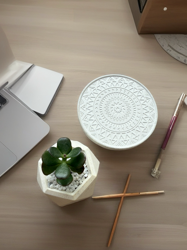 - Bandeja pequeña estilo mandala en yeso, hecha a mano para aportar equilibrio y armonía a tu decoración.