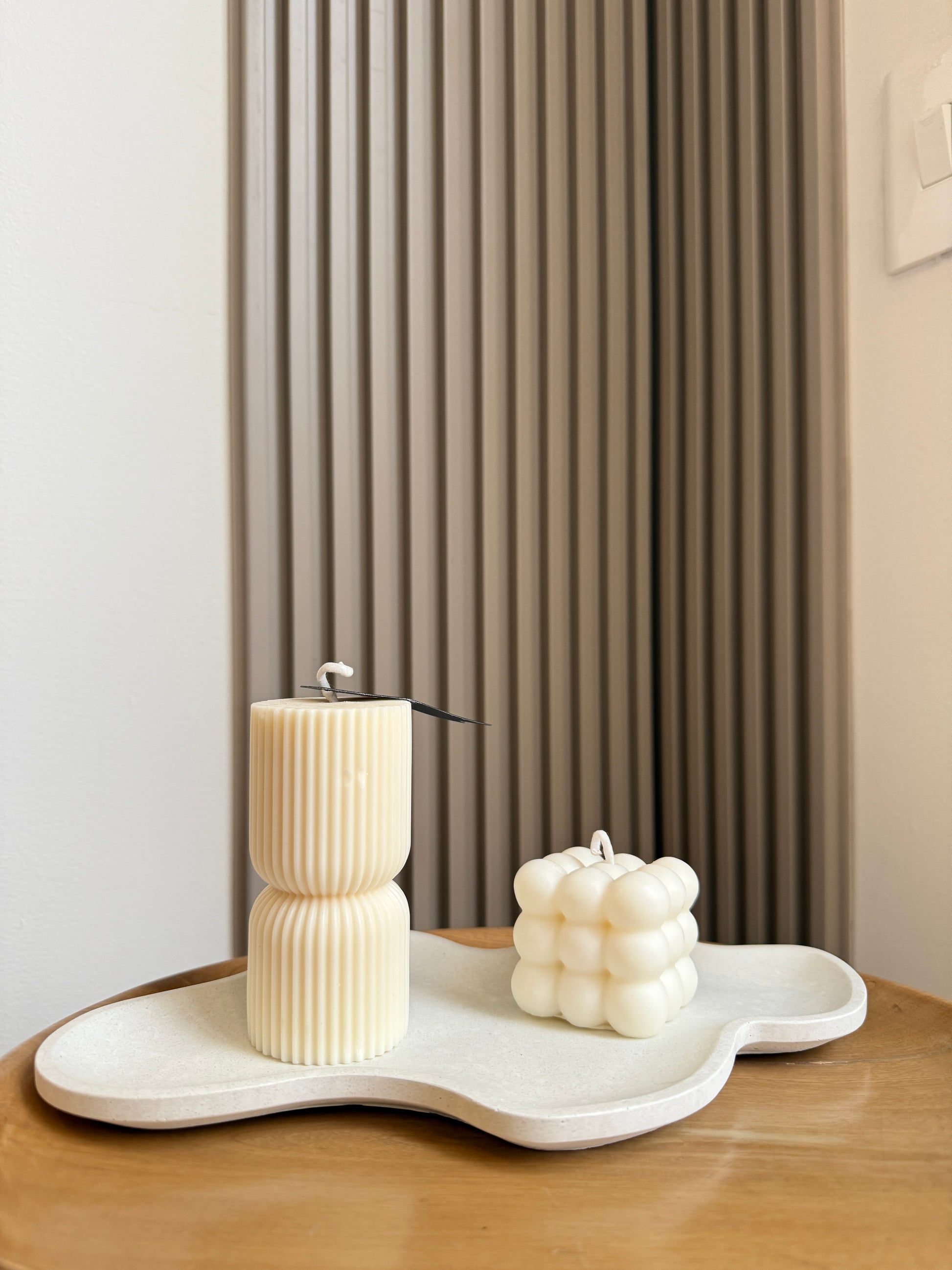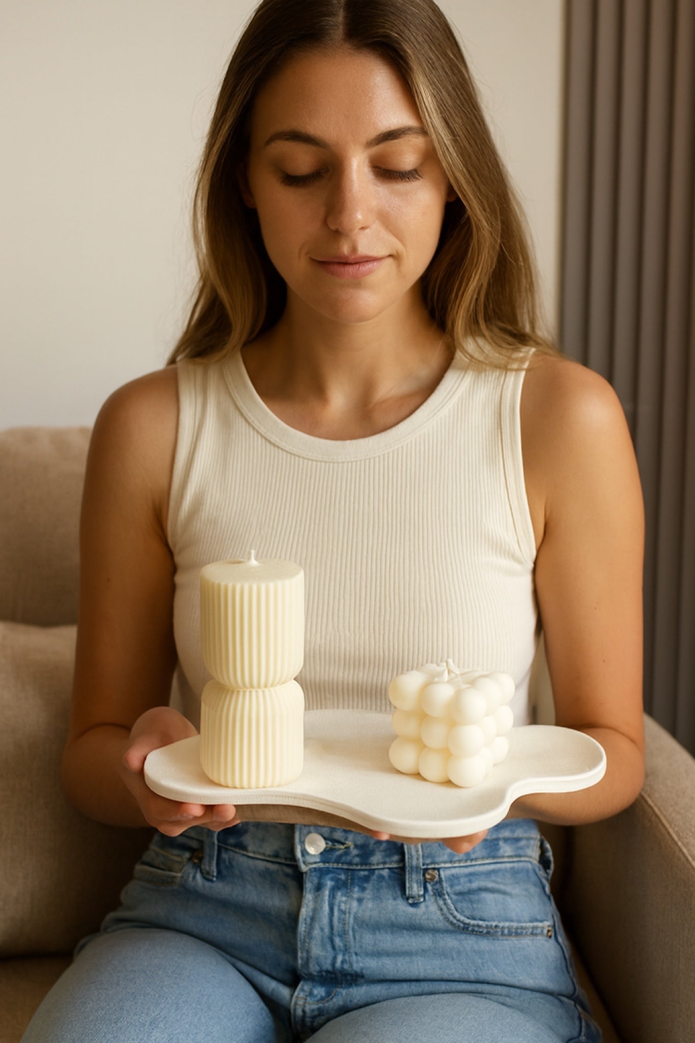 Incluye una bandeja Aura de concreto, de formas curvas y orgánicas, ideal para crear composiciones que inviten al orden, la calma y la belleza consciente. La acompaña una vela Dreamy Bubble, que despierta la imaginación y la conexión con tus deseos, y una Classic Candle, perfecta para equilibrar y envolver tus espacios con una luz serena y acogedora.